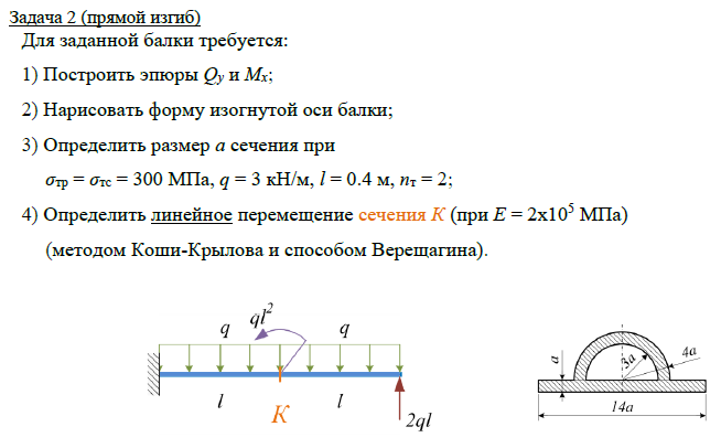 Задача 2 (прямой изгиб) Для заданной балки требуется: 1) Построить эпюры Qy и Mx; 2) Нарисовать форму изогнутой оси балки; 3) Определить размер а сечения при σтр = σтс = 300 МПа, q = 3 кН/м, l = 0.4 м, nт = 2; 4) Определить линейное перемещение сечения К (при Е = 2х105 МПа) (методом Коши-Крылова и способом Верещагина)..