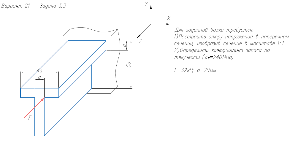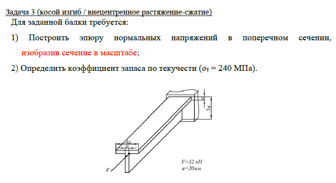 Задача 3 (косой изгиб / внецентренное растяжение-сжатие) Для заданной балки требуется: 1) Построить эпюру нормальных напряжений в поперечном сечении, изобразив сечение в масштабе; 2) Определить коэффициент запаса по текучести (σт = 240 МПа)..