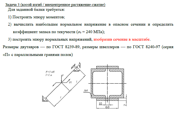 Задача 3 (косой изгиб / внецентренное растяжение-сжатие) Для заданной балки требуется: 1) Построить эпюру моментов; 2) вычислить наибольшее нормальное напряжение в опасном сечении и определить коэффициент запаса по текучести (σт = 240 МПа); 3) построить эпюру нормальных напряжений, изобразив сечение в масштабе. Размеры двутавров ⎯ по ГОСТ 8239-89, размеры швеллеров ⎯ по ГОСТ 8240-97 (серия «П» с параллельными гранями полок).