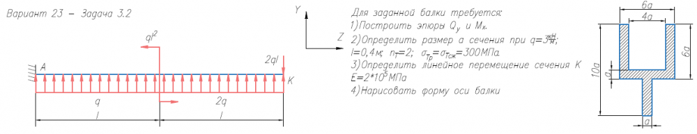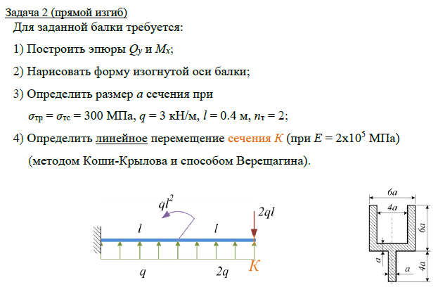 Задача 2 (прямой изгиб) Для заданной балки требуется: 1) Построить эпюры Qy и Mx; 2) Нарисовать форму изогнутой оси балки; 3) Определить размер а сечения при σтр = σтс = 300 МПа, q = 3 кН/м, l = 0.4 м, nт = 2; 4) Определить линейное перемещение сечения К (при Е = 2х105 МПа) (методом Коши-Крылова и способом Верещагина)..