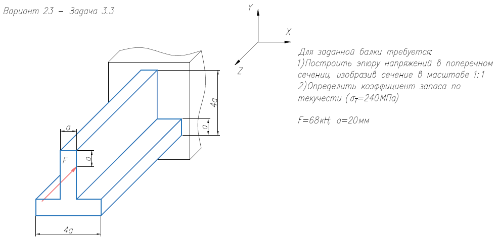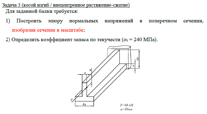 Задача 3 (косой изгиб / внецентренное растяжение-сжатие) Для заданной балки требуется: 1) Построить эпюру нормальных напряжений в поперечном сечении, изобразив сечение в масштабе; 2) Определить коэффициент запаса по текучести (σт = 240 МПа)..