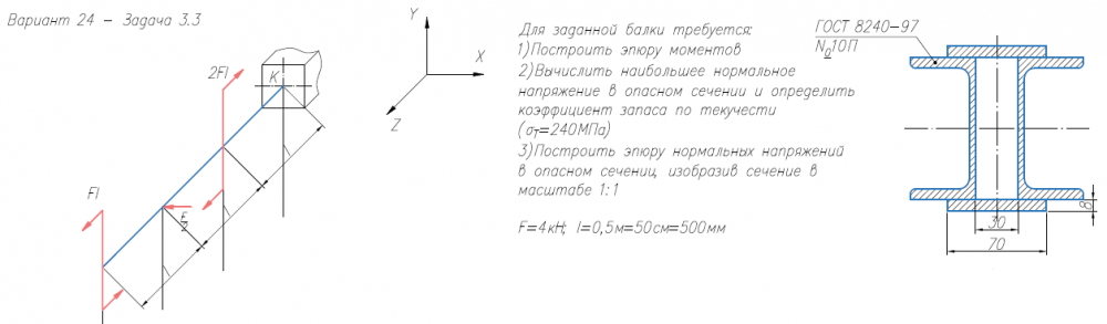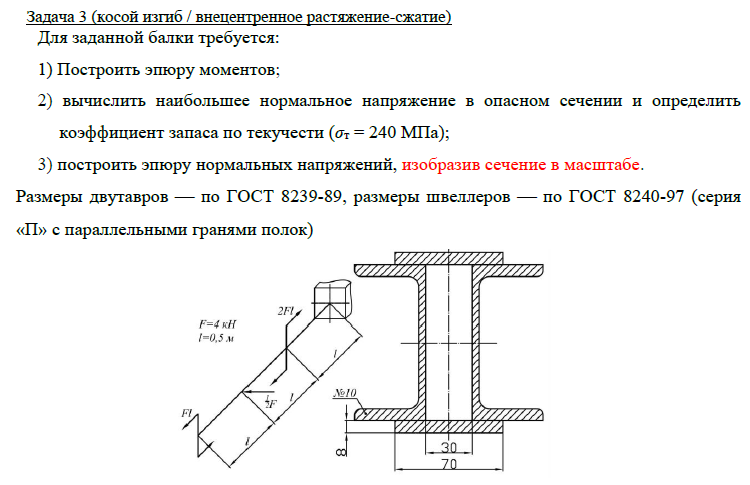 Задача 3 (косой изгиб / внецентренное растяжение-сжатие) Для заданной балки требуется: 1) Построить эпюру моментов; 2) вычислить наибольшее нормальное напряжение в опасном сечении и определить коэффициент запаса по текучести (σт = 240 МПа); 3) построить эпюру нормальных напряжений, изобразив сечение в масштабе. Размеры двутавров ⎯ по ГОСТ 8239-89, размеры швеллеров ⎯ по ГОСТ 8240-97 (серия «П» с параллельными гранями полок).