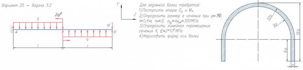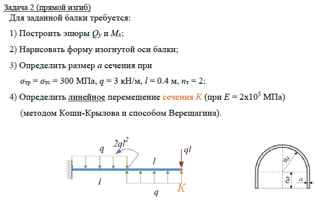 Задача 2 (прямой изгиб) Для заданной балки требуется: 1) Построить эпюры Qy и Mx; 2) Нарисовать форму изогнутой оси балки; 3) Определить размер а сечения при σтр = σтс = 300 МПа, q = 3 кН/м, l = 0.4 м, nт = 2; 4) Определить линейное перемещение сечения К (при Е = 2х105 МПа) (методом Коши-Крылова и способом Верещагина)..