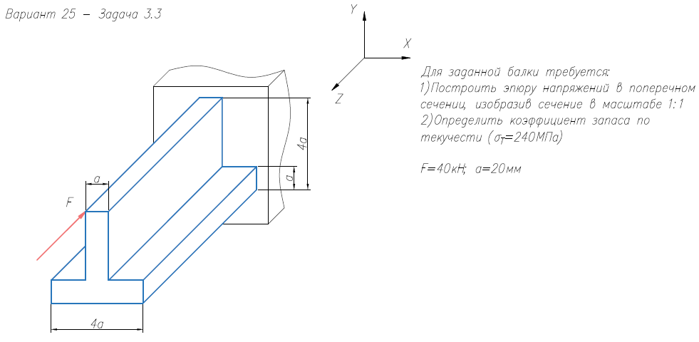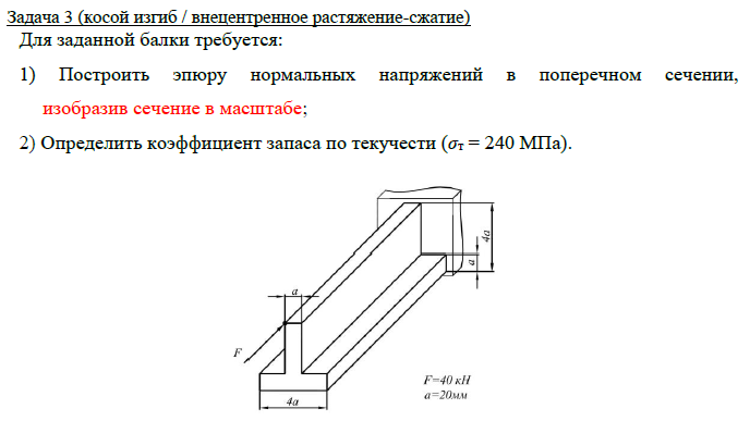 Задача 3 (косой изгиб / внецентренное растяжение-сжатие) Для заданной балки требуется: 1) Построить эпюру нормальных напряжений в поперечном сечении, изобразив сечение в масштабе; 2) Определить коэффициент запаса по текучести (σт = 240 МПа)..