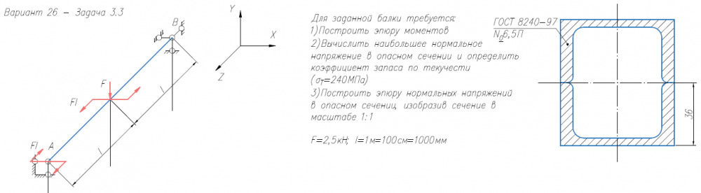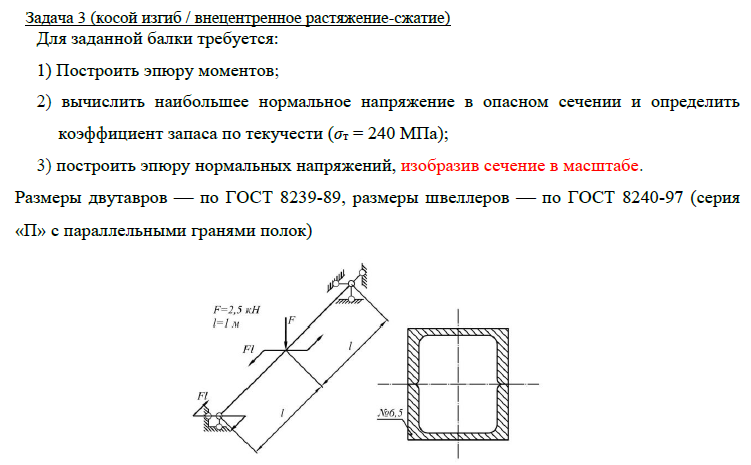 Задача 3 (косой изгиб / внецентренное растяжение-сжатие) Для заданной балки требуется: 1) Построить эпюру моментов; 2) вычислить наибольшее нормальное напряжение в опасном сечении и определить коэффициент запаса по текучести (σт = 240 МПа); 3) построить эпюру нормальных напряжений, изобразив сечение в масштабе. Размеры двутавров ⎯ по ГОСТ 8239-89, размеры швеллеров ⎯ по ГОСТ 8240-97 (серия «П» с параллельными гранями полок).