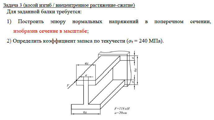 Задача 3 (косой изгиб / внецентренное растяжение-сжатие) Для заданной балки требуется: 1) Построить эпюру нормальных напряжений в поперечном сечении, изобразив сечение в масштабе; 2) Определить коэффициент запаса по текучести (σт = 240 МПа)..