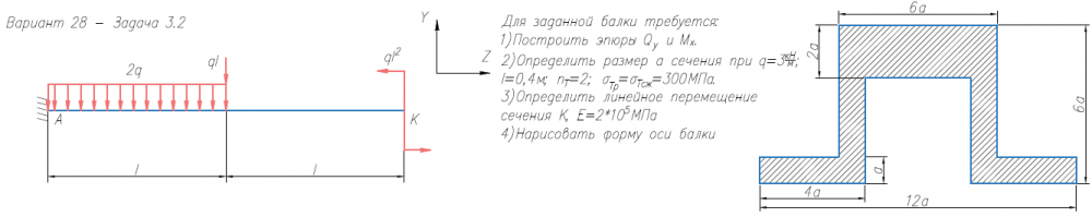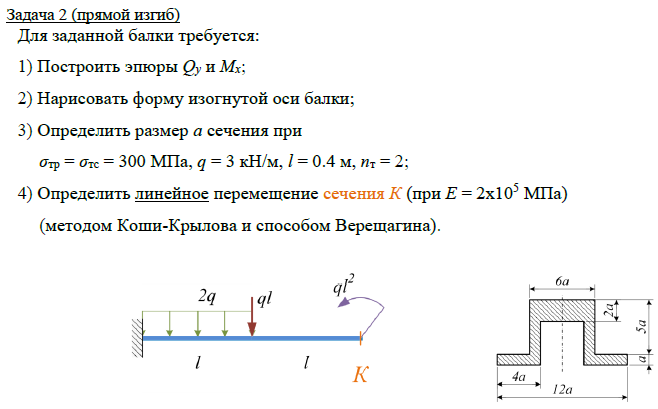 Задача 2 (прямой изгиб) Для заданной балки требуется: 1) Построить эпюры Qy и Mx; 2) Нарисовать форму изогнутой оси балки; 3) Определить размер а сечения при σтр = σтс = 300 МПа, q = 3 кН/м, l = 0.4 м, nт = 2; 4) Определить линейное перемещение сечения К (при Е = 2х105 МПа) (методом Коши-Крылова и способом Верещагина)..