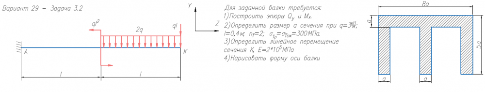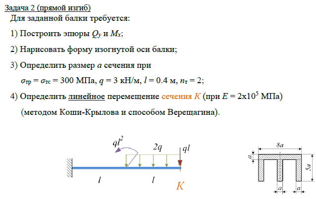 Задача 2 (прямой изгиб) Для заданной балки требуется: 1) Построить эпюры Qy и Mx; 2) Нарисовать форму изогнутой оси балки; 3) Определить размер а сечения при σтр = σтс = 300 МПа, q = 3 кН/м, l = 0.4 м, nт = 2; 4) Определить линейное перемещение сечения К (при Е = 2х105 МПа) (методом Коши-Крылова и способом Верещагина)..