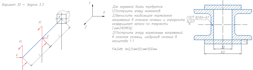 Задача 3 (косой изгиб / внецентренное растяжение-сжатие) Для заданной балки требуется: 1) Построить эпюру моментов; 2) вычислить наибольшее нормальное напряжение в опасном сечении и определить коэффициент запаса по текучести (σт = 240 МПа); 3) построить эпюру нормальных напряжений, изобразив сечение в масштабе. Размеры двутавров ⎯ по ГОСТ 8239-89, размеры швеллеров ⎯ по ГОСТ 8240-97 (серия «П» с параллельными гранями полок).