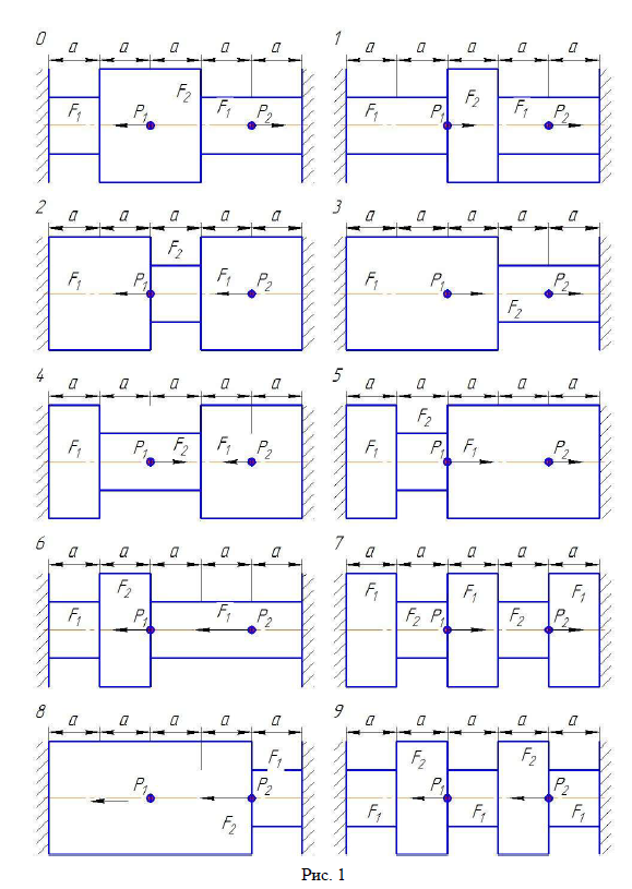 Для лучшего усвоения пройденного материала по-сле изучения каждой темы необходимо ответить на вопро-сы для самопроверки, приведенные в методических указа-ниях. ПРИЛОЖЕНИЯ Приложение 1 ЗАДАЧИ К КОНТРОЛЬНОЙ РАБОТЕ Задача 1. Стальной ступенчатый брус переменного сечения находится под действием продольных сил P1 и Р2. Расчетные схемы указаны на рис. 12, числовые дан-ные приведены в табл. П1.1. Принять модуль упругости при растяжении для ста-ли Е= МПа. Допускаемое напряжение для стали []=160 МПа. Требуется: 1. Построить эпюру нормальных сил. 2. Для заданной расчётной схемы оценить прочность конструкции и построить эпюру нормальных напряжений. 3. Определить абсолютное удлинение бруса с по-строением эпюры продольных перемещений.