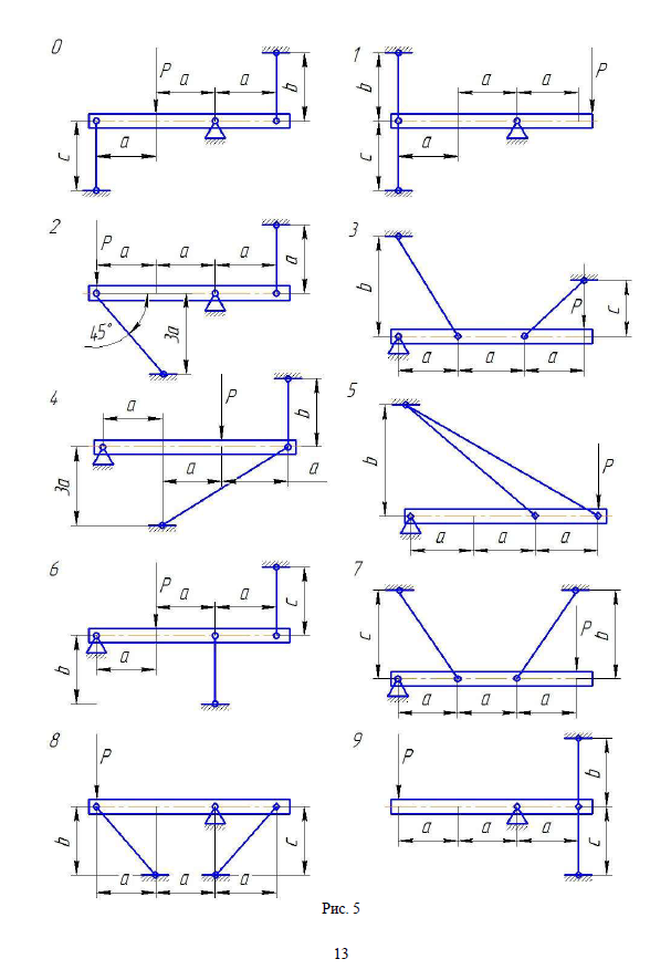 3. Построить эпюру действительных напряжений круче-ния по длине вала. 4. Построить эпюру углов закручивания, приняв G=8104 МПа. 5. Данные взять из табл. П1.2. Таблица П1.2. Вари-ант Расстояния, мМоменты, кНм МПа abcМ1М2М3М4 1 2 3 4 5 6 7 8 9 101,0 1,1 1,2 1,3 1,4 1,5 1,6 1,7 1,8 1,91,0 1,1 1,2 1,3 1,4 1,5 1,6 1,7 1,8 1,91,0 1,1 1,2 1,3 1,4 1,5 1,6 1,7 1,8 1,95,1 5,2 5,3 5,4 5,5 5,6 5,7 5,8 5,9 6,02,1 2,2 2,3 2,4 2,5 2,6 2,7 2,8 2,9 3,01,1 1,2 1,3 1,4 1,5 1,6 1,7 1,8 1,9 2,00,1 0,2 0,3 0,4 0,5 0,6 0,7 0,8 0,9 1,030 30 35 35 40 40 45 45 50 50 Рис.13. Расчетные схемы для решения задачи №2 Задача 3. Для заданной схемы балки (рис. 14) требу-ется: 1. Написать выражения Qz и My для каждого участка в общем виде.