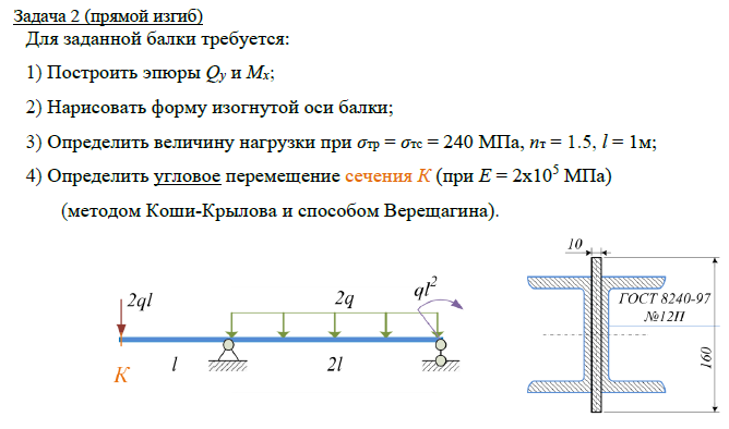 Задача 2 (прямой изгиб) Для заданной балки требуется: 1) Построить эпюры Qy и Mx; 2) Нарисовать форму изогнутой оси балки; 3) Определить величину нагрузки при σтр = σтс = 240 МПа, nт = 1.5, l = 1м; 4) Определить угловое перемещение сечения К (при Е = 2х105 МПа) (методом Коши-Крылова и способом Верещагина)..