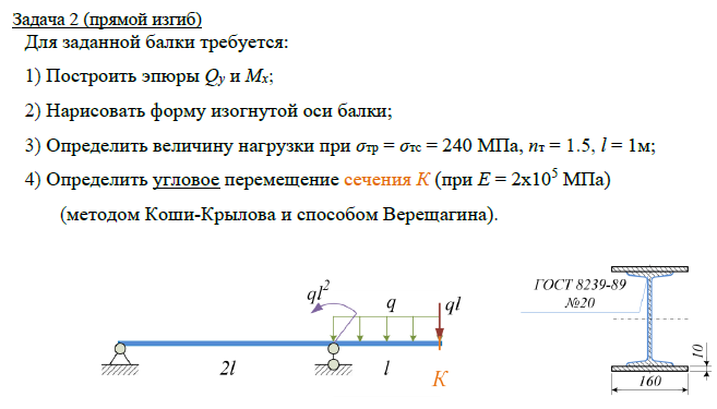 Задача 2 (прямой изгиб) Для заданной балки требуется: 1) Построить эпюры Qy и Mx; 2) Нарисовать форму изогнутой оси балки; 3) Определить величину нагрузки при σтр = σтс = 240 МПа, nт = 1.5, l = 1м; 4) Определить угловое перемещение сечения К (при Е = 2х105 МПа) (методом Коши-Крылова и способом Верещагина)..