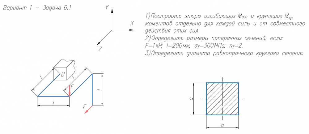 Задача 6.1 Построить эпюры изгибающих M/изг и крутящих M/кр моментов отдельно для каждой силы и от совместного действия этих сил. 2)Определить размеры поперечных сечений, если: F=1кН; l=200мм, σ/Т=300МПа; n/Т=2. 3)Определить диаметр равнопрочного круглого сечения..