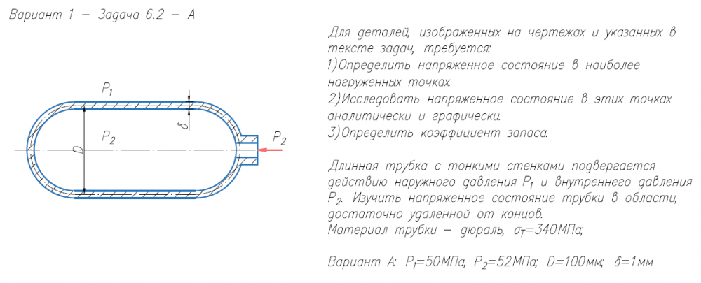 Задача 6.2 - A. Для деталей, изображенных на чертежах и указанных в тексте задач, требуется: 1)Определить напряженное состояние в наиболее нагруженных точках. 2)Исследовать напряженное состояние в этих точках аналитически и графически. 3)Определить коэффициент запаса. Длинная трубка с тонкими стенками подвергается действию наружного давления P/1 и внутреннего давления P/2. Изучить напряженное состояние трубки в области, достаточно удаленной от концов. Материал трубки - дюраль, σ/Т=340МПа; Вариант А: P/1=50МПа, P/2=52МПа; D=100мм; δ=1мм..
