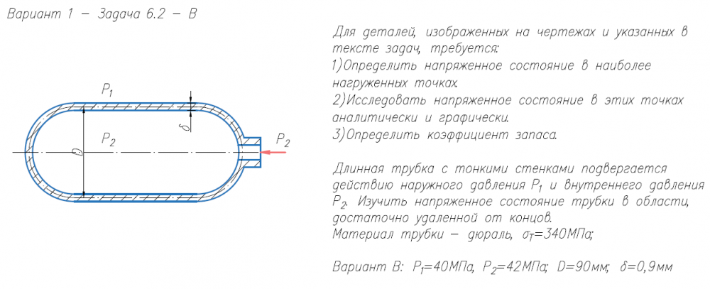 Задача 6.2 - A. Для деталей, изображенных на чертежах и указанных в тексте задач, требуется: 1)Определить напряженное состояние в наиболее нагруженных точках. 2)Исследовать напряженное состояние в этих точках аналитически и графически. 3)Определить коэффициент запаса. Длинная трубка с тонкими стенками подвергается действию наружного давления P/1 и внутреннего давления P/2. Изучить напряженное состояние трубки в области, достаточно удаленной от концов. Материал трубки - дюраль, σ/Т=340МПа; Вариант B: P/1=40МПа, P/2=42МПа; D=90мм; δ=0,9мм.