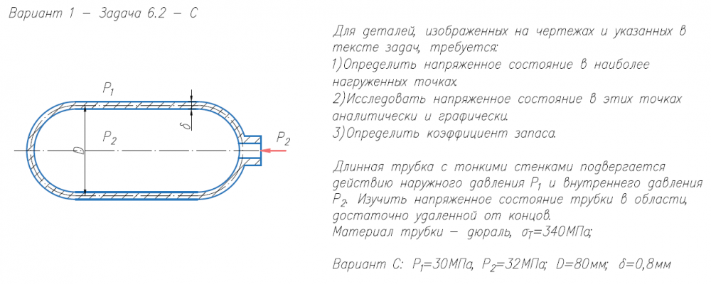 Задача 6.2 - A. Для деталей, изображенных на чертежах и указанных в тексте задач, требуется: 1)Определить напряженное состояние в наиболее нагруженных точках. 2)Исследовать напряженное состояние в этих точках аналитически и графически. 3)Определить коэффициент запаса. Длинная трубка с тонкими стенками подвергается действию наружного давления P/1 и внутреннего давления P/2. Изучить напряженное состояние трубки в области, достаточно удаленной от концов. Материал трубки - дюраль, σ/Т=340МПа; Вариант C: P/1=30МПа, P/2=32МПа; D=80мм; δ=0,8мм.