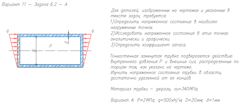 Задача 6.2. Для деталей, изображенных на чертежах и указанных в тексте задач, требуется: 1)Определить напряженное состояние в наиболее нагруженных точках. 2)Исследовать напряженное состояние в этих точках аналитически и графически. 3)Определить коэффициент запаса. Тонкостенная замкнутая трубка подвергается действию внутреннего давления P и внешних сил, распределенных по торцам так, как указано на чертеже. Изучить напряженное состояние трубки в области, достаточно удаленной от ее концов. Материал трубки - дюраль, σ/Т=340МПа; Вариант А: P=2МПа; q=500кН/м; D=20мм; δ=1мм.