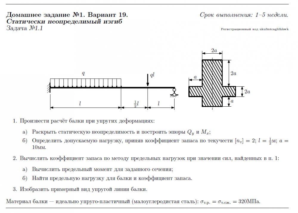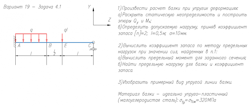1)Произвести расчет балки при упругих деформациях: а)Раскрыть статическую неопределимость и построить эпюры Q/y и M/x; б)Определить допускаемую нагрузку, приняв коэффициент запаса [n]=2; l=0,5м; a=10мм. 2)Вычислить коэффициент запаса по методу предельных нагрузок при значении сил, найденных в п.1: а)Вычислить предельный момент для заданного сечения; б)Найти предельную нагрузку для балки и коэффициент запаса. 3)Изобразить примерный вид упругой линии балки. Материал балки - идеально упруго-пластичный (малоуглеродистая сталь):σ/Тр=σ/Тсж=320МПа.