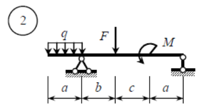Вариант абвгде=203102; a=1,2 м; b=2,6 м; c=2,6 м; F=2 кН; M=11кНм; q=12 кН/м.