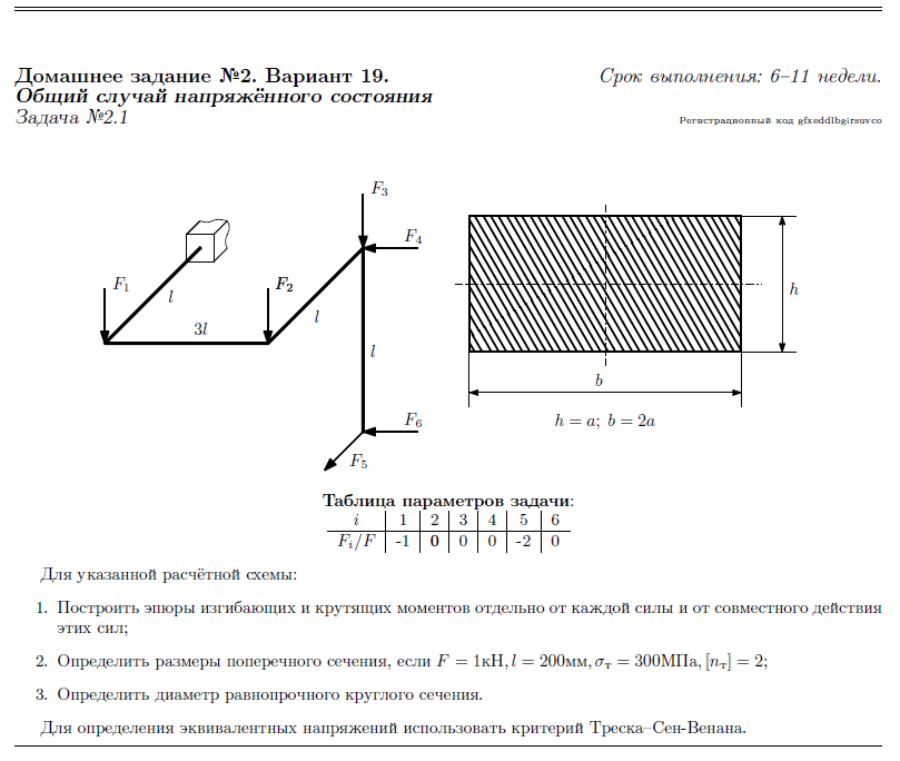 1)Построить эпюры изгибающих M/изг и крутящих M/кр моментов отдельно от каждой силы и от совместного действия этих сил. 2)Определить размеры поперечного сечения, если: F=1кН; l=200мм, σ/Т=300МПа; n/Т=2. 3)Определить диаметр равнопрочного круглого сечения..