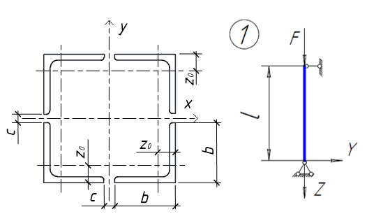 Определить: допускаемую нагрузку из условия устойчивости, критическую нагрузку и коэффициент запаса устойчивости – для стойки заданной формы поперечного сечения, а также для стойки кольцевого сечения. Оба сечения имеют одинаковую площадь, для кольца известно соотношение диаметров: α=d/D=0,9.