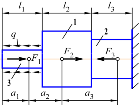 Дано: вариант 294; схема 2; l1=1,4м; l2=1,2м; l3=0,9м; а1=0,7м; а2=1,6м; а3=0,8м; F1=30кН; F2=20кН; F3=40кН; q=30кН/м. Сталь 20Х; σТ=850МПа; nТ=2.