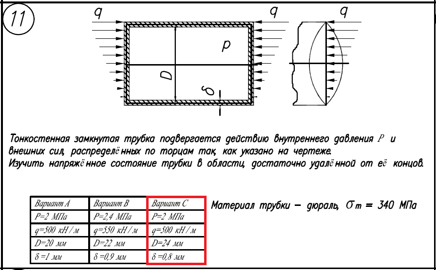 Задача 6.2.Для деталей, изображенных на чертежах и указанных в тексте задач, требуется: 1)Определить напряженное состояние в наиболее нагруженных точках. 2)Исследовать напряженное состояние в этих точках аналитически и графически. 3)Определить коэффициент запаса. Тонкостенная замкнутая трубка подвергается действию внутреннего давления P и внешних сил, распределенных по торцам так, как указано на чертеже. Изучить напряженное состояние трубки в области, достаточно удаленной от ее концов. Материал трубки - дюраль, σ/Т=340МПа; Вариант C: P=2МПа; q=500кН/м; D=24мм; δ=0,8мм..