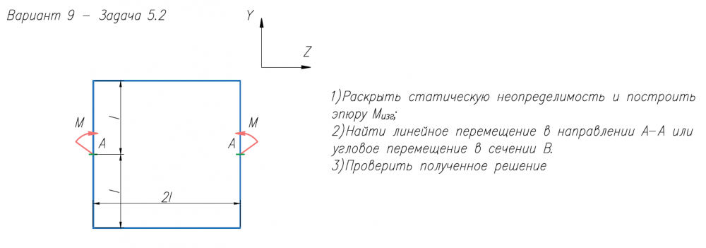 1)Раскрыть статическую неопределимость и построить эпюру M/изг; 2)Найти линейное перемещение в направлении А-А или угловое перемещение в сечении В. 3)Проверить полученное решение.