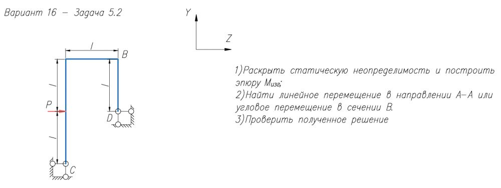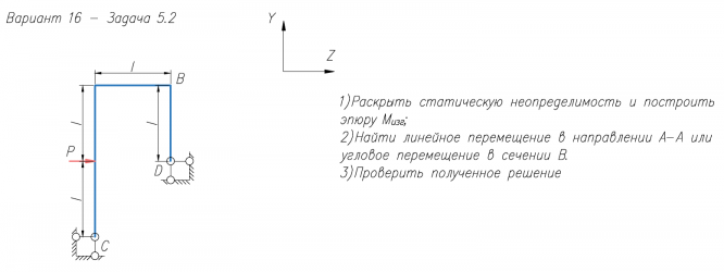 1)Раскрыть статическую неопределимость и построить эпюру M/изг; 2)Найти линейное перемещение в направлении А-А или угловое перемещение в сечении В. 3)Проверить полученное решение.