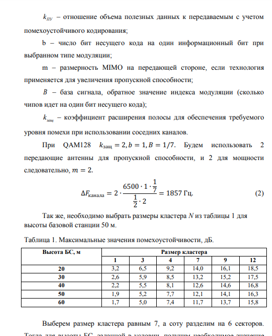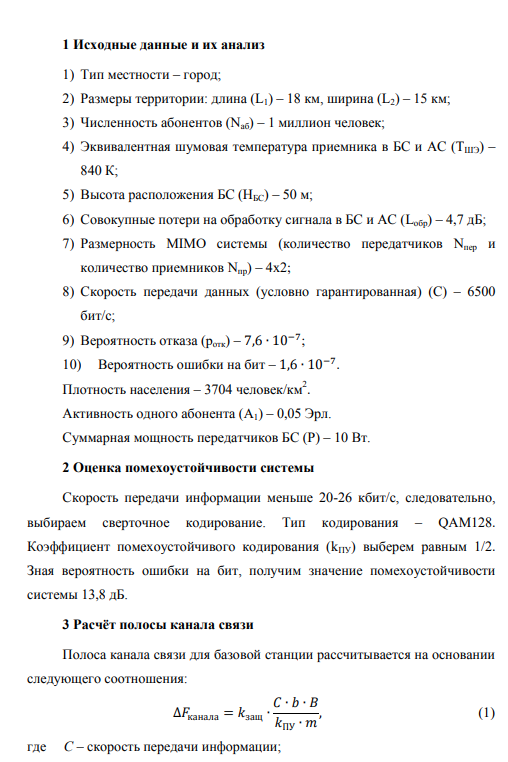 Исходные данные и их анализ 1) Тип местности – город; 2) Размеры территории: длина (L1) – 18 км, ширина (L2) – 15 км; 3) Численность абонентов (Nаб) – 1 миллион человек; 4) Эквивалентная шумовая температура приемника в БС и АС (TШЭ) – 840 К; 5) Высота расположения БС (HБС) – 50 м; 6) Совокупные потери на обработку сигнала в БС и АС (Lобр) – 4,7 дБ; 7) Размерность MIMO системы (количество передатчиков Nпер и количество приемников Nпр) – 4x2; 8) Скорость передачи данных (условно гарантированная) (С) – 6500 бит/с; 9) Вероятность отказа (pотк) – 7,6 ∙ 10−7 ; 10) Вероятность ошибки на бит – 1,6 ∙ 10−7 . Плотность населения – 3704 человек/км 2 . Активность одного абонента (A1) – 0,05 Эрл. Суммарная мощность передатчиков БС (P) – 10 В