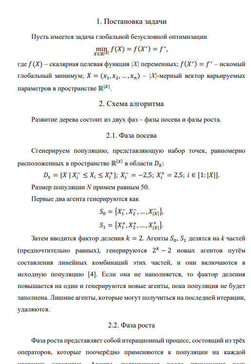 Алгоритм растущих деревьев (Saplings Growing Up Algorithm, SGA) – алгоритм оптимизации, вдохновленный развитием саженцев деревьев в природе, и включает в себя две фазы – фаза посева и фаза роста [1], [2]. SGA можно определить как итерационные процессы генерации и изменения агентов в области решений, называемых саженцами. В общем, процесс SGA состоит из операторов вариации, генерирующих новые варианты решения с выбором, ограничивающим пространство поиска. Основные операторы – скрещивание, ветвление и прививка. Кроме того, SGA не требует ни дифференцируемости, ни непрерывности целевой функции задачи оптимизации [3]. Благодаря этому, SGA может быть легко применен к различным задачам оптимизации.