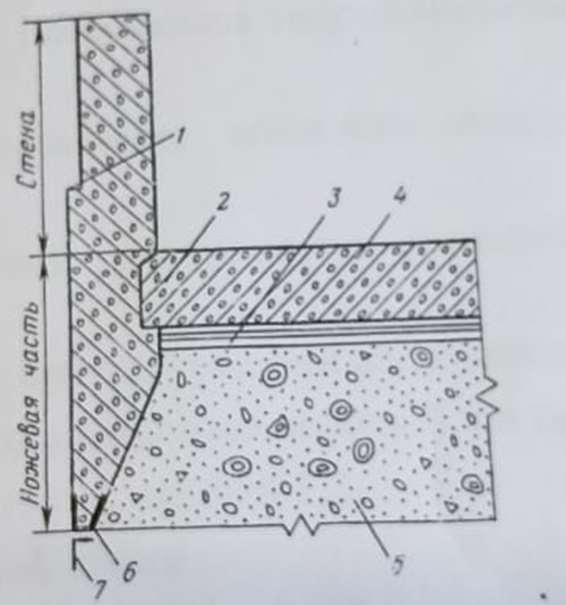 Рисунок 1 – Основные конструктивные элементы опускного сооружения: 1 – наружный выступ; 2 – паз для днища; 3 – гидроизоляция; 4 – железобетонное днище; 5 – бетонная подушка; 6 – банкетка; 7 – металлический нож.