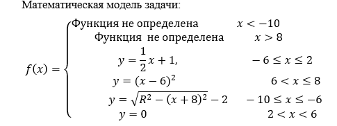 Составить алгоритм для вычисления значения функции, заданной в виде графика, по введенному значению аргумента. Параметр R ввести с клавиатуры.