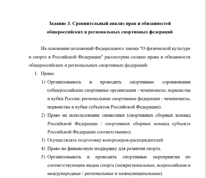 Задание 3. Сравнительный анализ прав и обязанностей общероссийских и региональных спортивных федераций. Объем - 3 страницы.