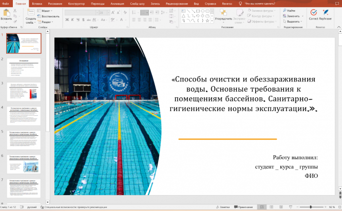 Презентация с докладом по Спортивным сооружениям на тему "Способы очистки и обеззараживания воды. Основные требования к помещениям бассейнов. Санитарно-гигиенические нормы эксплуатации". Объем работы - 12 слайдов.