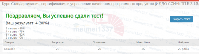 Для студентов ИДДО НИУ «МЭИ» по предмету Стандартизация, сертификация и управление качеством программных продуктовПолный курс Итоговая работа - 80%Полный курс Итоговая работа - 80%