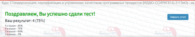 Курс Стандартизация, сертификация и управление качеством программных продуктов - КМ-1. Стандартизация и сертификация. Жизненный цикл программного обеспечения. Тестирование - 75%
