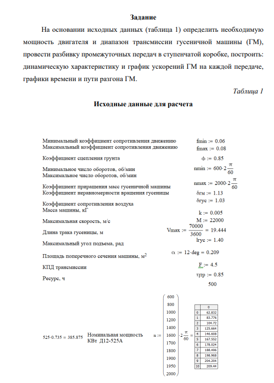 На основании исходных данных (таблица 1) определить необходимую мощность двигателя и диапазон трансмиссии гусеничной машины (ГМ), провести разбивку промежуточных передач в ступенчатой коробке, построить: динамическую характеристику и график ускорений ГМ на каждой передаче, графики времени и пути разгона ГМ.