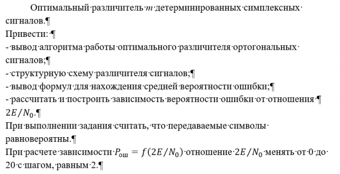 Главная » Учебные материалы » Статистическая радиотехника » Домашние задания » МГТУ им. Н.Э.Баумана » 6 семестр » Вариант 19 » Оптимальный различитель m детерминированных симплексных сигналов