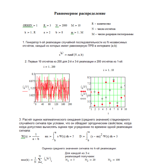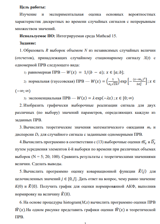 Цель работы: Изучение и экспериментальная оценка основных вероятностных ха рактеристик дискретных во времени случайных сигналов с непрерывным множеством значений. Используемое ПО: Интегрируемая среда Mathcad 15. Задание: 1. Образовать R выборок объемом N из независимых случайных величин (отсчетов), принадлежащих случайному стационарному сигналу X(t) с одномерной ПРВ следующего вида: