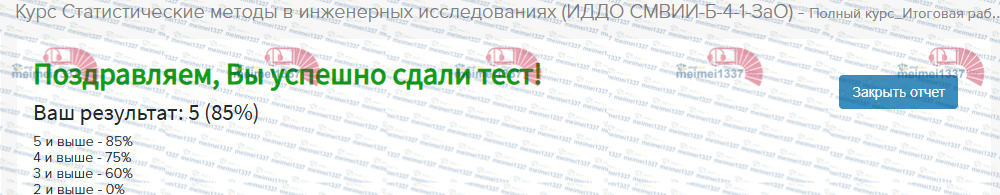 Для студентов ИДДО НИУ «МЭИ» по предмету Статистические методы в инженерных исследованияхПолный курс Итоговая работа - 85%Полный курс Итоговая работа - 85%