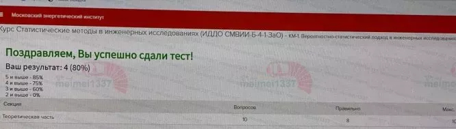 Для студентов ИДДО НИУ «МЭИ» по предмету Статистические методы в инженерных исследованияхПомощь со сдачей - КМ-1. Вероятностно-статистический подход в инженерных исследованиях. ТестированиеПомощь со сдачей - КМ-1. Вероятностно-статистический подход в инженерных исследованиях. Тестирование