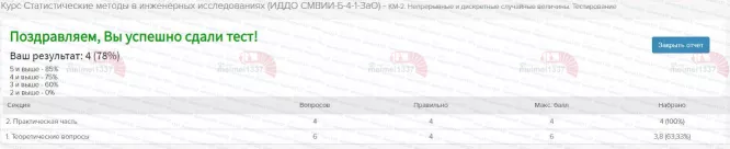 Для студентов ИДДО НИУ «МЭИ» по предмету Статистические методы в инженерных исследованияхКурс Статистические методы в инженерных исследованиях - КМ-2. Непрерывные и дискретные случайные величины. ТестированиеКурс Статистические методы в инженерных исследованиях - КМ-2. Непрерывные и дискретные случайные величины. Тестирование
