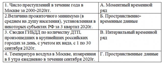 Если стоимость всей проданной продукции в отчетном периоде по сравнению с базисным периодом за счет изменения количества продукции снизилась на 2%, то: Тип ответа: Одиночный выбор • с выбором одного правильного ответа из нескольких предложенных вариантов lq=0,98; lq=0,80; lq = 1,02; lpq=0,98. Переменная «число дождливых дней в октябре» относится к типу: Тип ответа: Одиночный выбор • с выбором одного правильного ответа из нескольких предложенных вариантов категориальная номинальная; категориальная порядковая; количественная дискретная; количественная непрерывная. Соотнесите название и способ определения соответствующего относительного показателя Тип ответа: Одиночный выбор • с выбором одного правильного ответа из нескольких предложенных вариантов 1-А, 2-Г, 3-Б, 4-В; 1-Г, 2-А, 3-В, 4-Б; 1-Б, 2-А, 3-Г, 4-В; 1-Б, 2-Г, 3-В, 4-А.
