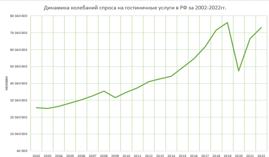 Год | Динамика колебаний спроса на гостиничные услуги в РФ за 2002 2022гг. (человек) |