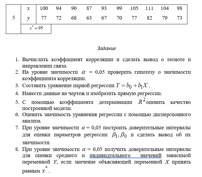 - При уровне значимости a = 0,05 получить доверительные интервалы для оценки среднего и индивидуального значений зависимой переменной Y, если значение объясняющей переменной X принять равным