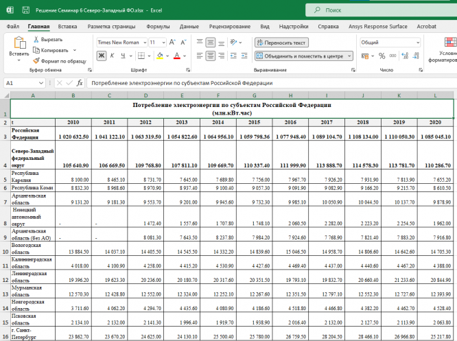 Условие: Потребление электроэнергии по субъектам Российской Федерации (млн.кВт.час) t20102011201220132014201520162017201820192020 Российская Федерация 1 020 632.50 1 041 122.10 1 063 319.50 1 054 822.60 1 064 956.10 1 059 798.36 1 077 948.40 1 089 104.70 1 108 134.00 1 110 050.30 1 085 045.10 Северо-Западный федеральный округ 105 640.90 106 669.50 109 768.80 107 811.10 109 669.70 110 337.40 111 999.90 113 888.70 114 578.30 113 781.70 110 286.70 Республика Карелия 8 100.00 8 465.10 8 731.70 7 645.00 7 689.80 7 756.00 7 967.70 7 926.20 7 931.90 7 813.90 7 655.20 Республика Коми 8 832.30 8 968.60 8 970.90 8 937.40 9 100.40 9 057.30 9 091.90 9 082.90 9 166.20 9 215.70 8 610.50 Архангельская область 9 131.20 9 181.30 9 553.70 9 201.00 9 945.60 9 732.30 9 985.10 10 050.90 10 044.50 10 137.70 9 878.90 Hенецкий автономный округ - - 1 472.40 1 557.60 1 707.80 1 748.10 2 060.50 2 282.00 2 223.20 2 254.50 1 962.00 Архангельская область (без АО) - - 8 081.30 7 643.50 8 237.80 7 984.20 7 924.60 7 768.90 7 821.40 7 883.20 7 916.80 Вологодская область 13 884.50 14 037.10 14 405.50 14 545.50 14 332.20 14 839.60 15 046.50 14 958.70 14 806.60 14 642.60 14 705.30 Калининградская область 4 018.00 4 100.90 4 258.00 4 415.20 4 530.90 4 427.60 4 469.40 4 437.00 4 440.60 4 467.20 4 388.00 Ленинградская область 19 396.20 19 623.30 20 236.00 20 180.70 20 317.60 20 351.50 19 793.10 19 832.70 20 660.40 21 233.60 20 844.90 Мурманская область 12 570.30 12 428.80 12 552.00 12 324.00 12 252.10 12 267.60 12 351.50 12 797.10 12 552.30 12 727.60 12 393.90 Новгородская область 3 711.60 4 062.20 4 294.70 4 435.60 4 080.90 4 186.60 4 518.80 4 466.80 4 382.20 4 462.70 4 528.40 Псковская область 2 134.10 2 132.00 2 141.30 1 996.40 1 919.70 1 938.90 2 016.40 2 132.00 2 127.50 2 113.90 2 063.80 г.