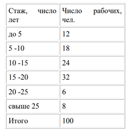 В целях изучения стажа рабочих завода проведена 36%-ная механическая выборка, в результате которой получено следующее распределение рабочих по стажу работы: На основе этих данных вычислите: • Средний стаж рабочих завода. • Моду и медиану стажа ра