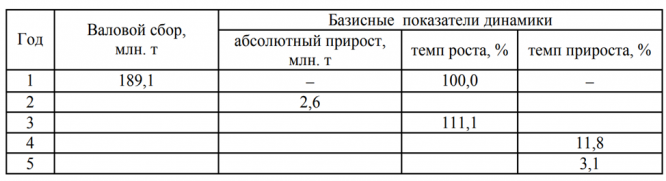 Используя взаимосвязь показателей динамики, определите уровни динамического ряда и недостающие в таблице базисные показатели анализа динамики по следующим данным о валовом сборе зерна за пять лет: